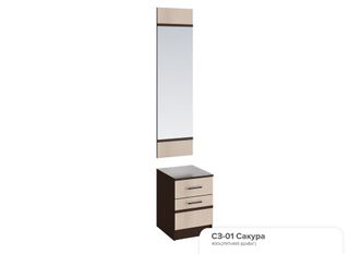 Тумба с зеркалом СЗ-01 состоит из навесного зеркала, выкатного ящика для мелочей и выкатной тумбы под обувь на роликовых направляющих.