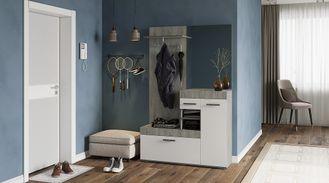 Прихожая «Инстайл» создана для разных интерьерных решений. Неоднородность структуры и холодные оттенки бетона идеально сочетаются с белым глянцевым декором, что позволяет создать уникальный интерьер без особого труда. Данная модель оснащена закрытыми ящиками, отсеками и иными элементами, обеспечивающими удобство хранения различных предметов гардероба. Важная деталь – зеркало облагороженное еврокромкой, которое придает изделию завершенность, четко подчеркивает, как его безопасность, так и презентабельность. Лаконичная простота конструкции, вместительность и очарование цветового решения – явные преимущества прихожей из модульной системы «Инстайл».