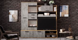 Стильная современная гостиная для амбициозных харизматичных людей, сделанная в одном из самых узнаваемых и популярных стилей «лофт». Промышленный гламур – достаточно эффектное решение, придающее оформлению жилой зоны особенный характер. Декор, эмитирующий бетонную поверхность в сочетании с природной естественностью и грацией, смотрится очень оригинально. Состоит из двух модулей – центральной секции и шкафа. Центральная секция будто бы специально создана для малогабаритной квартиры или квартиры-студии, привлекая внимание своим изяществом и неповторимостью. А вместительный двустворчатый шкаф с ассиметричными дверками, прекрасно дополнит её и удачно впишется в любые габариты городского стиля.